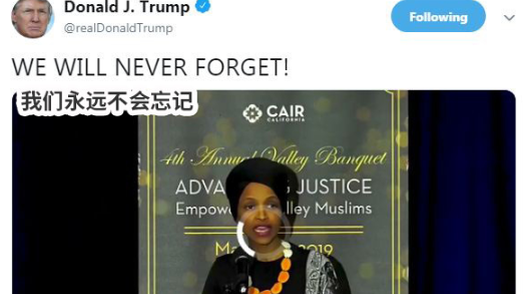 而特朗普4月12日的加入使得该事件的矛盾进一步升级。这位总统在推特上写道:“我们永远不会忘记”。同时还上传了一段视频,其间穿插着奥马尔讲话的画面和发生9·11的现场。